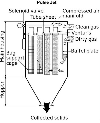 Pulse-jet baghouses use short, high-pressure bursts of compressed air to clean filter bags while filtration continues.
